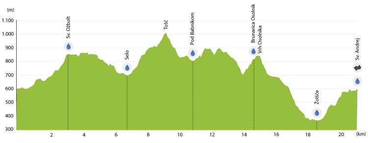 m), kjer se začne zadnji, dolg spust v dolino Hrastnice in še zadnji vzpon do cilja na Sv. Andreju.